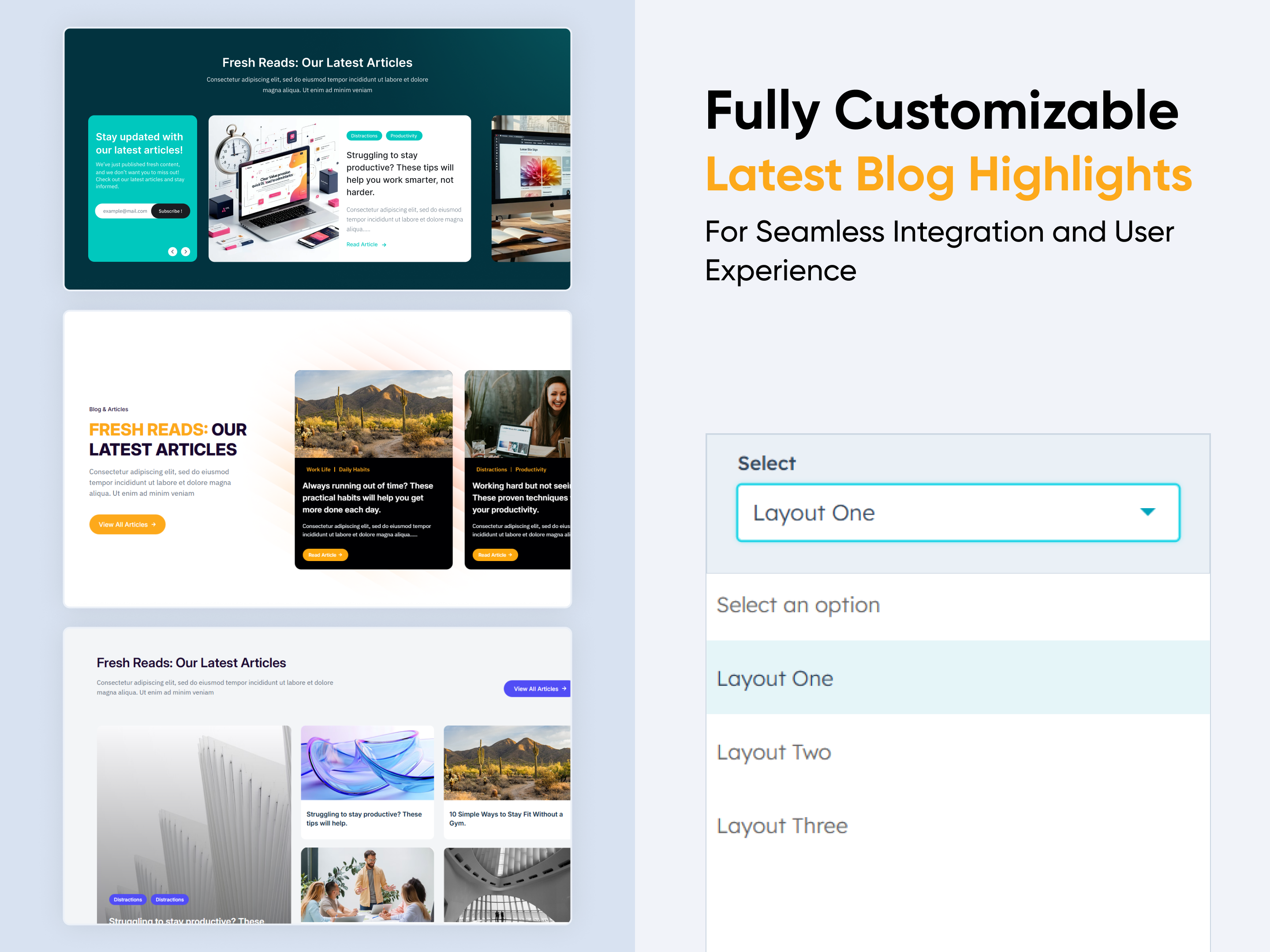 Choose your ideal layout (Layout 1, 2, or 3) and effortlessly arrange your cards to create the perfect visual flow. With Latest Blog Highlights, you can reorder content with ease, ensuring a smooth, well-structured, and engaging user experience every time.
