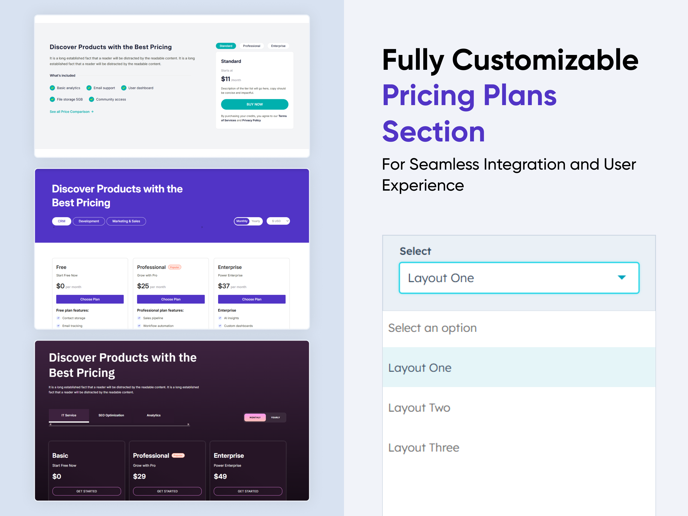 - Layout 2 : The layout features a Tabs, toggle Monthly, Yearly & currency toggle with plan cards.
